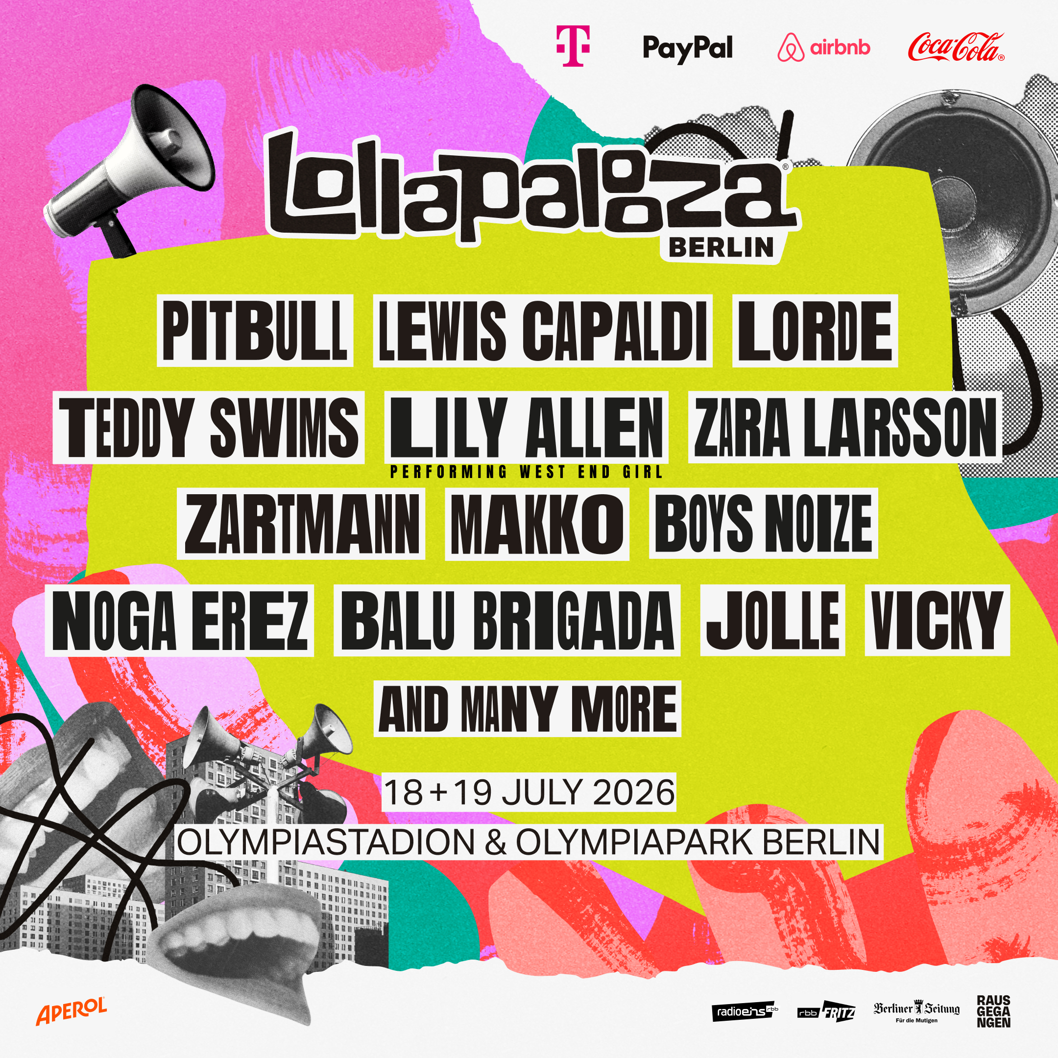 Das Lollapalooza Berlin kehrt am 18. und 19. Juli 2026 in das Olympiastadion Berlin und den Berliner Olympiapark zurück. Erste bestätigte Acts sind unter anderem Pitbull, Lewis Capaldi, Lorde, Teddy Swims, Lily Allen, Zara Larsson und Zartmann.