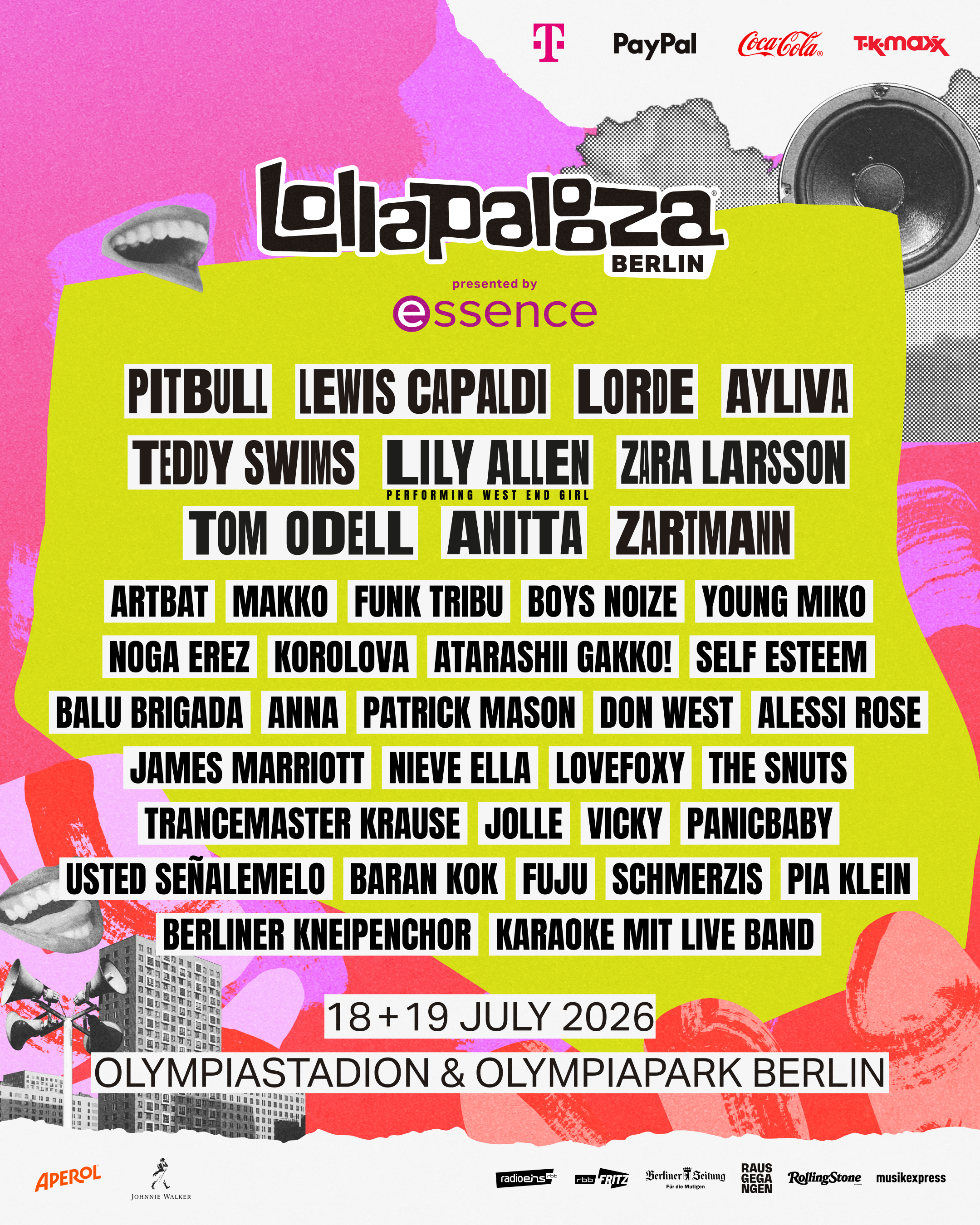 Berlin, 26.02.2026 – Zwei Tage, unzählige musikalische Highlights und atemberaubende Performances: Am 18. und 19. Juli übernimmt das Lollapalooza Berlin presented by essence erneut den Berliner Olympiapark. Internationale Stars treffen auf spannende Newcomer:innen aus Pop, Latin und Indie. Neben den bereits verkündeten Künstler:innen wie Pitbull, Lewis Capaldi, Lorde, Teddy Swims, Lily Allen (performing West End Girl), Zara Larsson, Zartmann, makko und Boys Noize kommen nun weitere Top-Acts hinzu.